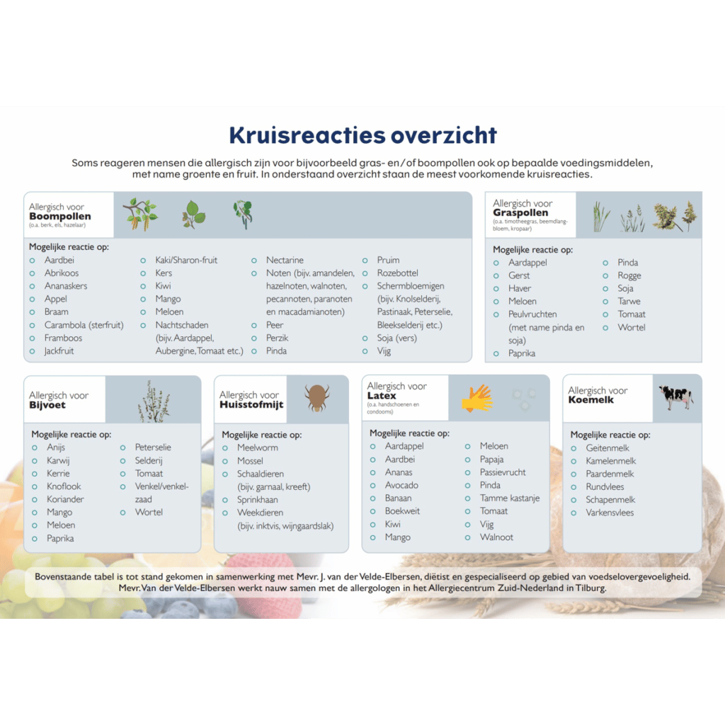 Scheurblok met overzicht van veelvoorkomende kruisreacties. Handig om in beeld te brengen voor de patiënt.